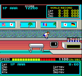 The Commodore 64 version is the only home conversion that is accurate to the arcade version. The other home conversions done by Konami and released in Japan differ from the arcade release to various degrees. The MSX conversions are released across three volumes, the first of which only includes the long horse from the arcade game. The other events are High Dive, Horizontal Bar, and Trampoline